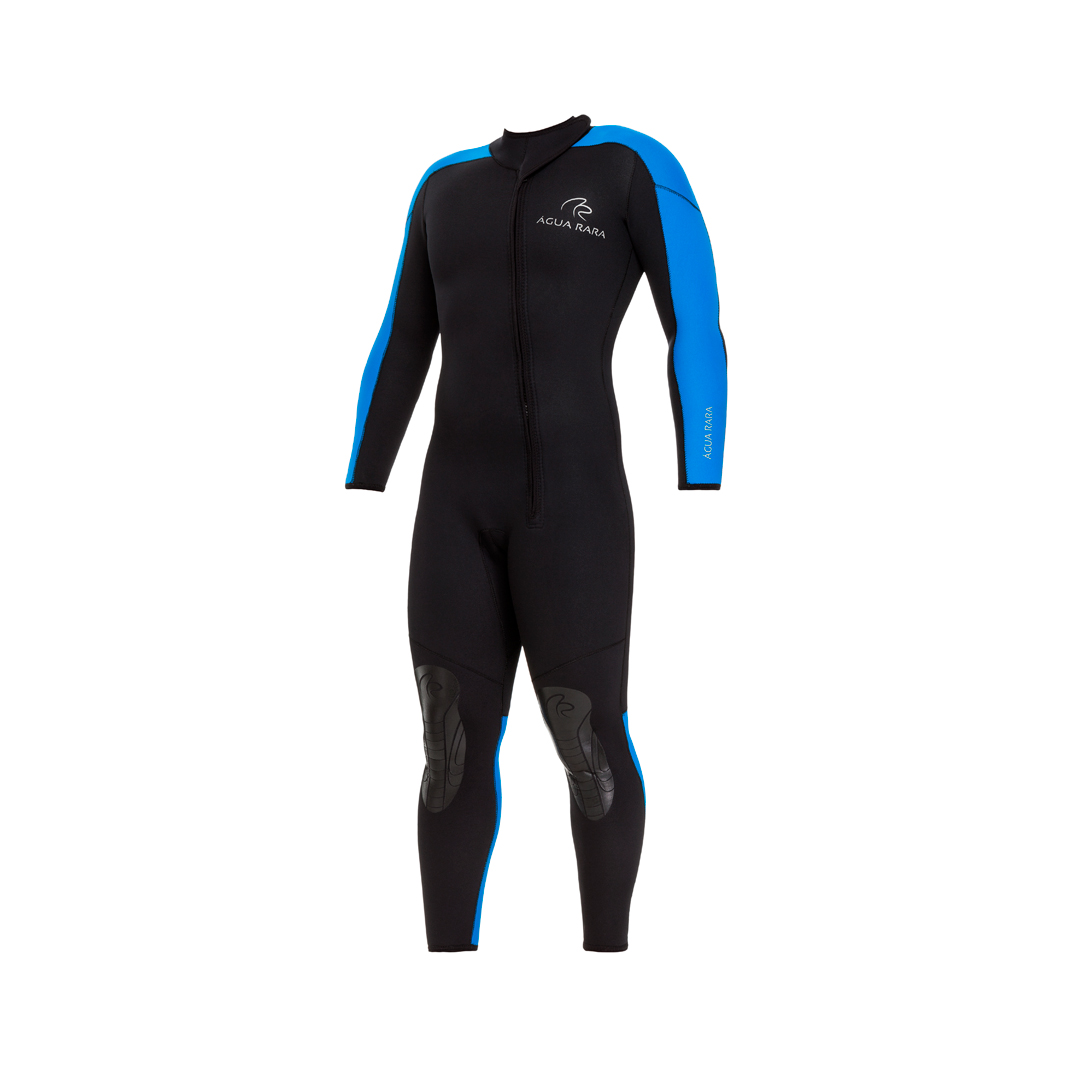 Macacão de neoprene 3mm ou 5mm com corte anatômico, reforços em plastisol e zíper frontal. Ideal para escolas e operações de mergulho.